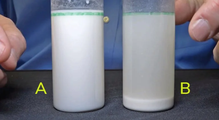 Como se puede ver en la imagen, el recipiente A muestra una correcta compatibilidad dada una mezcla homogénea; en contraste el recipiente B contiene precipitados al fondo del mismo, notándose una clara mezcla heterogénea, lo cual puede llegar a generar inconvenientes en la aplicación.